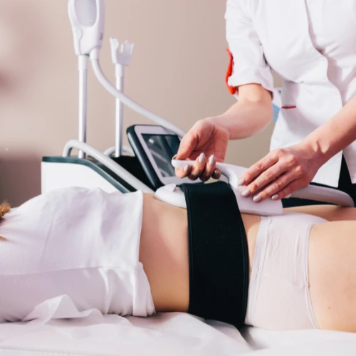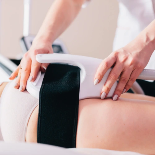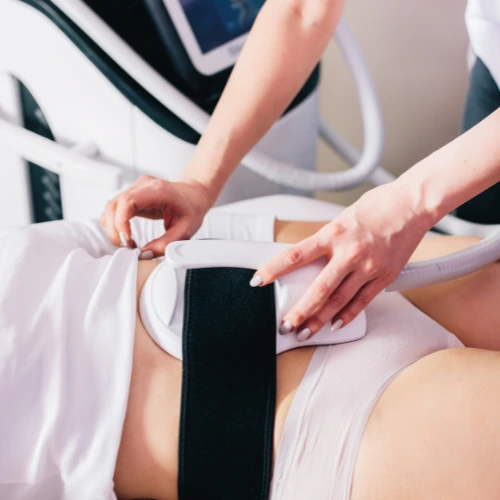 We utilize an advanced body sculpting system that combines HI-EMT with RF to induce deep muscle contractions and achieve targeted fat reduction simultaneously.